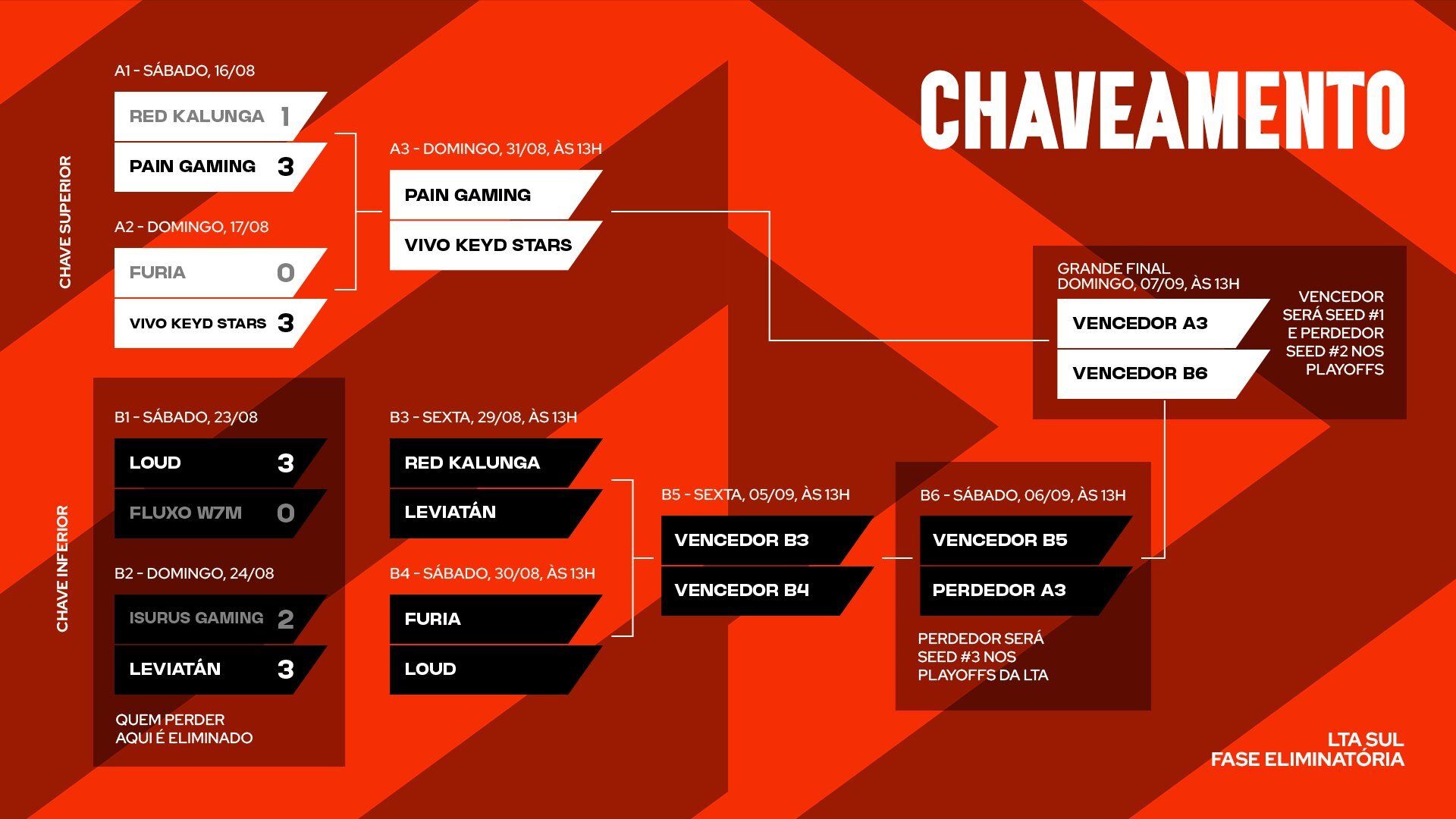 Sextou na LTA Sul com confrontos já à partir de hoje! Com super semana, a rodada tem início com RED x LEVIATAN às 13h, pela chave inferior, valendo eliminação para o perdedor. No sábado (30), a FURIA enfrenta a LOUD também pela permanência, às 13h. Os vencedores desses confrontos pela chave inferior se enfrentam na rodada seguinte. No domingo (31), às 13h, a paiN e a Vivo Keyd lutam pela vaga na grande final.