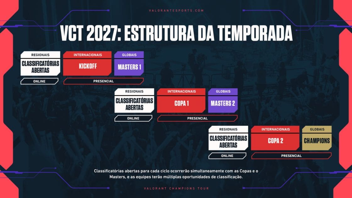 A Riot resolveu chacoalhar tudo e, a partir de 2027, o VCT abandona de vez o esquema de ligas para virar um circuito de torneios com qualificatórias abertas. Sim, agora todo mundo entra na mesma fila, parceiros ou não. O modelo vira semiaberto, com times buscando vaga várias vezes ao ano. As antigas ligas regionais dão lugar às Copas VCT, que viram o novo caminho para Masters e Champions, todos disputados em LAN para aproximar o público e inflar o calendário. Na prática, a reformulação deixa o VCT muito mais parecido com o ecossistema do CS: nada de ligas fixas, e sim um circuito guiado por torneios, qualificatórias abertas e acesso totalmente baseado em desempenho.