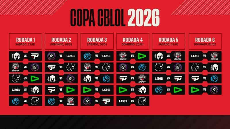 A Copa CBLOL 2026 já tem data para começar e não vai dar muito tempo para aquecimento: o primeiro split inicia em 17 de janeiro, com final marcada para 28 de fevereiro, reunindo oito equipes em um novo formato que mistura fase regular em Md1, Play-In e Playoffs em eliminação dupla. Além de inaugurar essa “nova velha” fase do CBLOL, o torneio ainda garante vaga no First Stand 2026, que será disputado em São Paulo.